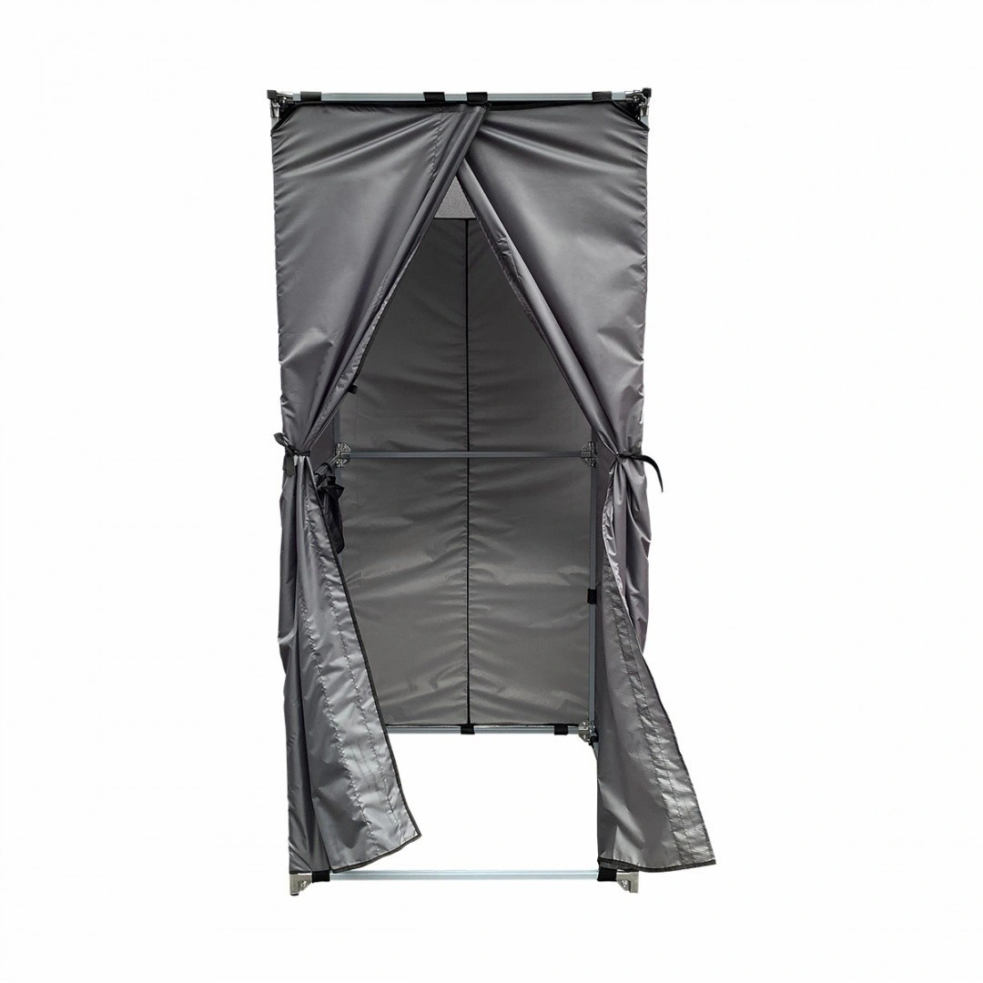 Тент душевой кабины изготовлен из влагостойкого материала. Верхняя часть - сетка, пропускающая свет и свежий воздух. Дверцы закрываются на магнитный замок, делая использование еще комфортнее. Внутри, на удобной высоте, есть карман – сумка для банных принадлежностей, а на полу – мягкий резиновый коврик.
