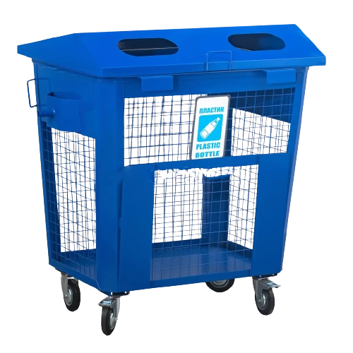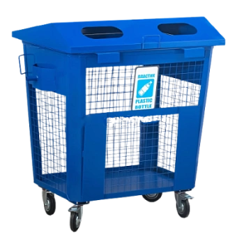 Сетчатый контейнер для сбора пластика КСМ-0,9 П – это металлическая конструкция на колесах, которая изготовлена из металла 2 мм и сетки с ячейкой 50х50х3 мм.