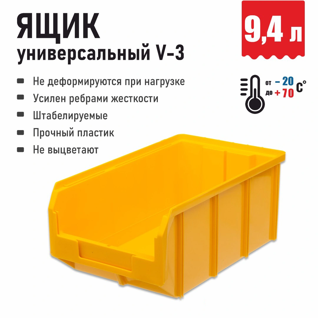 Пластиковый ящик V-3 (342х207х143мм.), широко применяется для организации мест хранения мелких деталей, различных комплектующих и запасных частей, различных узлов и агрегатов. Передняя стенка при помощи прозрачного ограничителя можно нарастить для увеличения объема ящика. Специальный карман на лицевой части позволяет размещать ярлык с описанием ассортимента хранящихся мелочей для более быстрого поиска необходимого контейнера. В сочетании с системами хранения серии V, пластиковые ящики организуют любое пространство, будь то гараж, магазин, автосервис или склад. Материал: ударопрочный полипропилен. Габаритные характеристики ящика V-3: длина 342мм., ширина 207мм., высота 143мм. Объем 9.4л. Температура эксплуатации от -20 до +70С.
