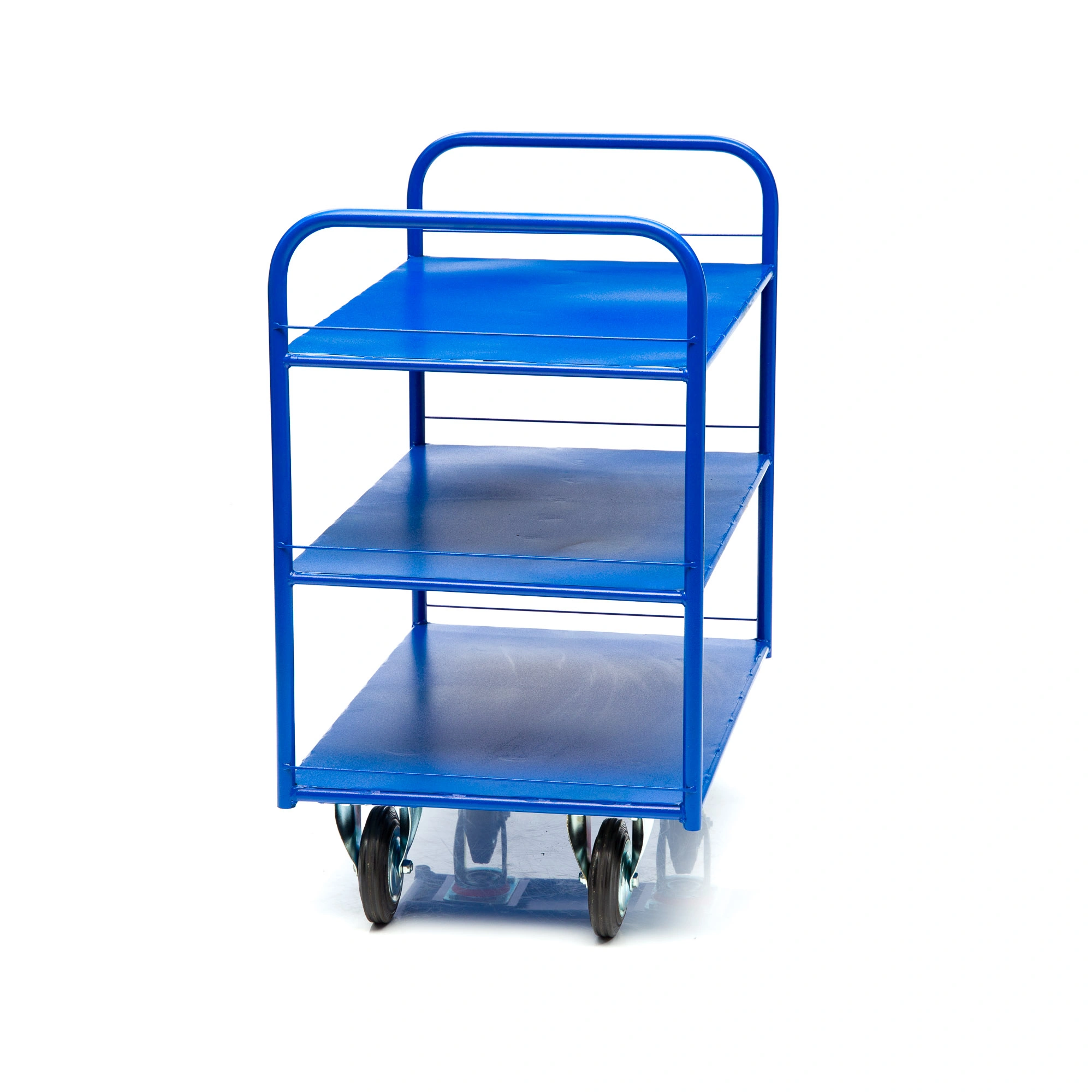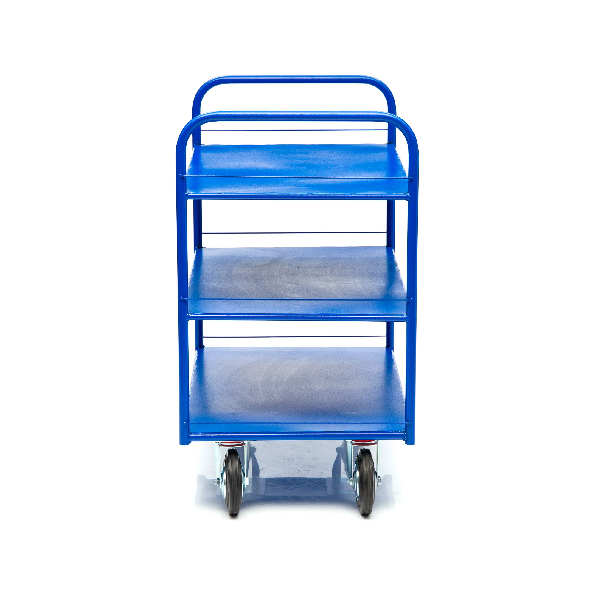 Платформенная трехъярусная 4-х колесная тележка КР-3-150-И предназначена для перевозки малогабаритных грузов. Платформа металлическая толщина листа 1,2мм. Размер платформы 600х900мм. Расстояние между ярусами 300мм. Количество ярусов 3 шт. Габаритная высота 1000мм. Покрытие полимерное. Цвет - синий, шагрень. Тележка КР-3-150-И комплектуется: двумя поворотными и двумя неповоротными промышленными колесами, диаметром 150мм., из черной стандартной резины, от всемирно известного, ведущего итальянского производителя Tellure Rota, метизами для крепления. Благодаря наличию трех ярусов, тележка широко используется на складах, в торговых павильонах, а также в гостиничном и ресторанном бизнесе. Грузоподъемность до 450кг.
