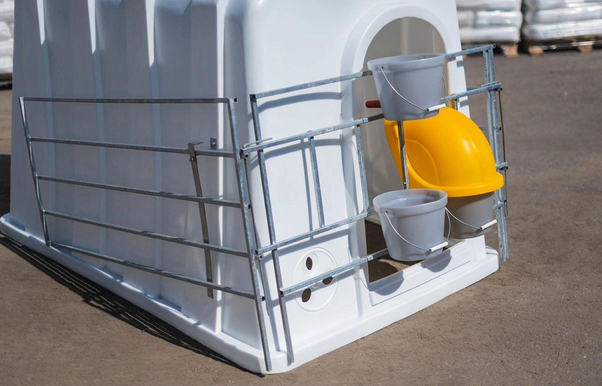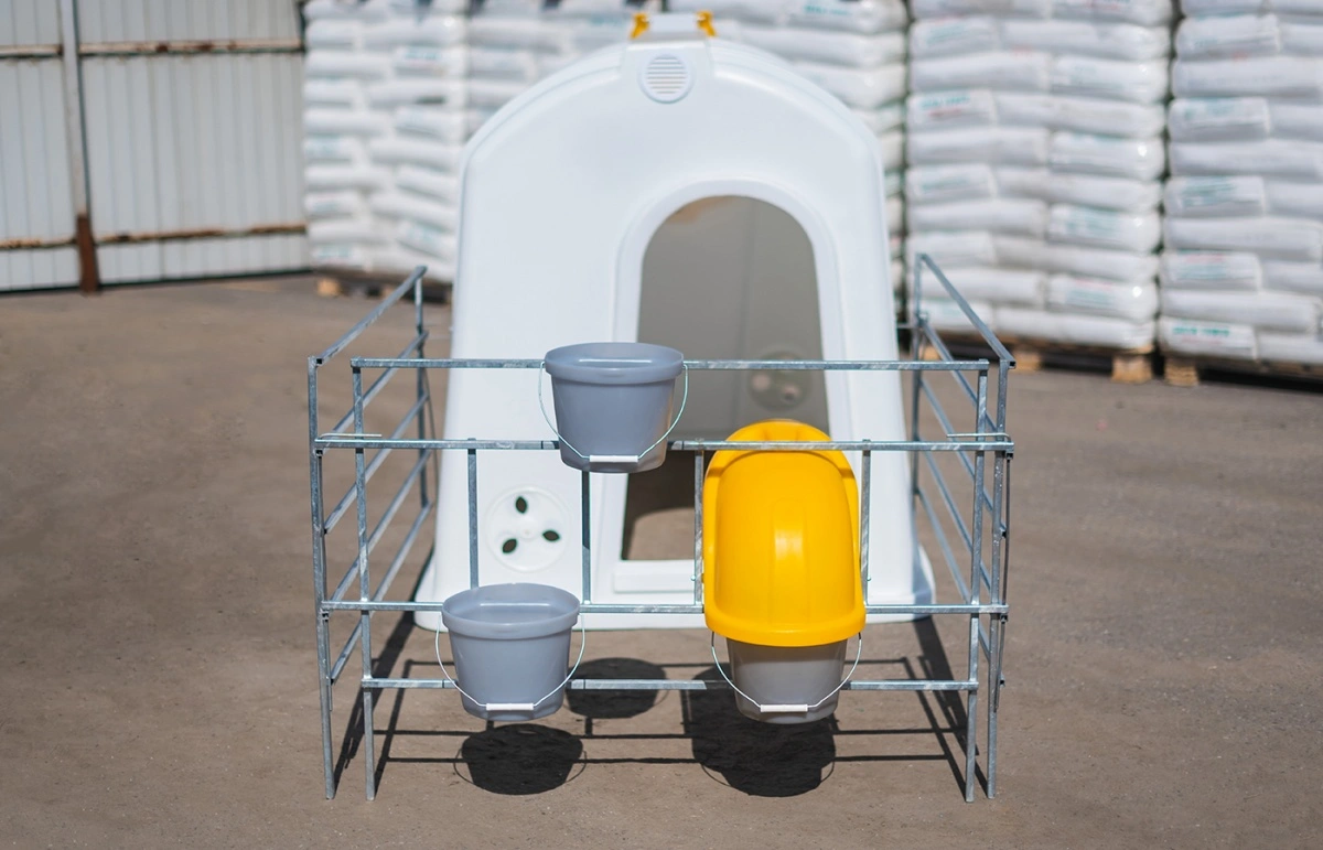 Рекомендуем для эксплуатации с индивидуальным большим домиком для телят, фермерскими ведрами для воды и корма, защитным колпаком, ведром для выпойки и пологом.